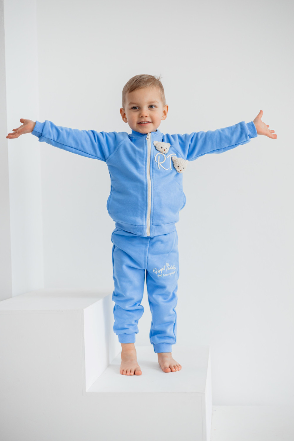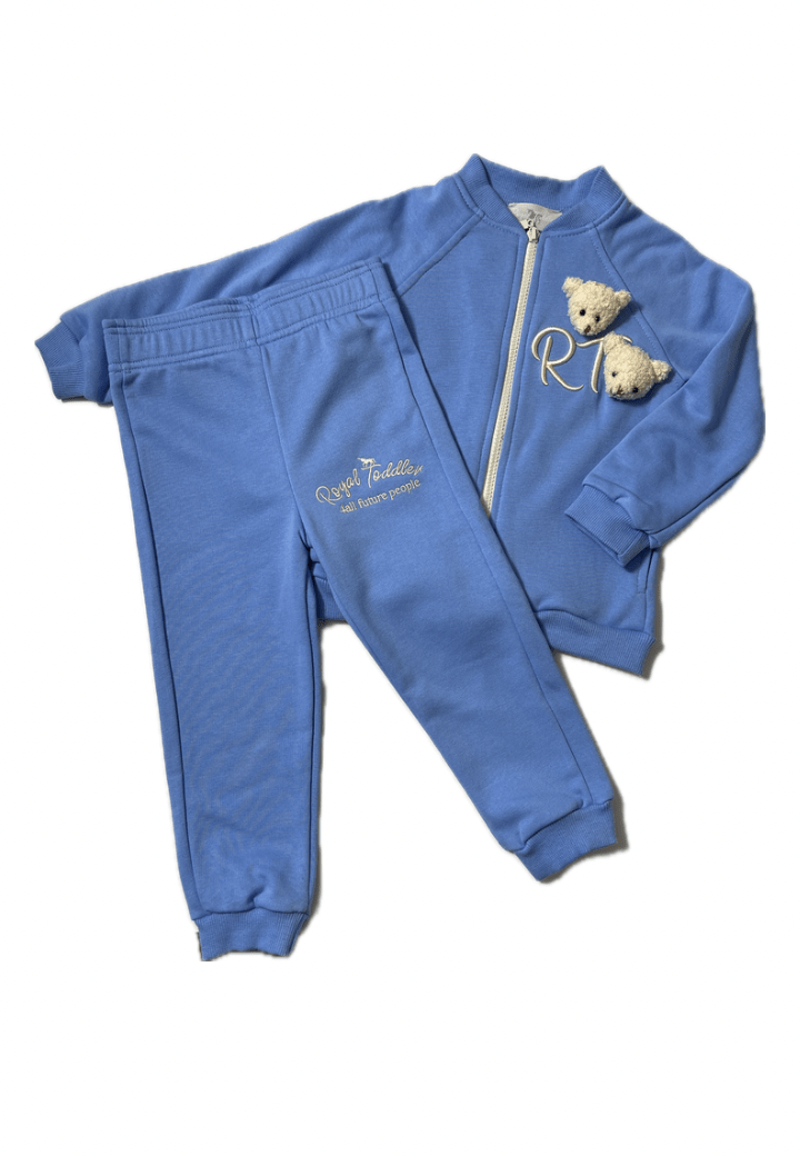 Uroczy niebieski dres HUGS to idealne połączenie wygody i chłopięcego stylu. Wykonany z miękkiego, przyjemnego w dotyku materiału zapewnia komfort noszenia przez cały dzień. Zestaw składa się z rozpinanej bluzy i spodni, a uroku dodają przyszyte maskotki misiaków, które sprawiają, że dres staje się jeszcze bardziej wyjątkowy, z kolei haftowane logo podkreśla dbałość o detale. To doskonały wybór na co dzień - do przedszkola, na spacer czy domowe zabawy, gwarantując styl i wygodę w jednym.